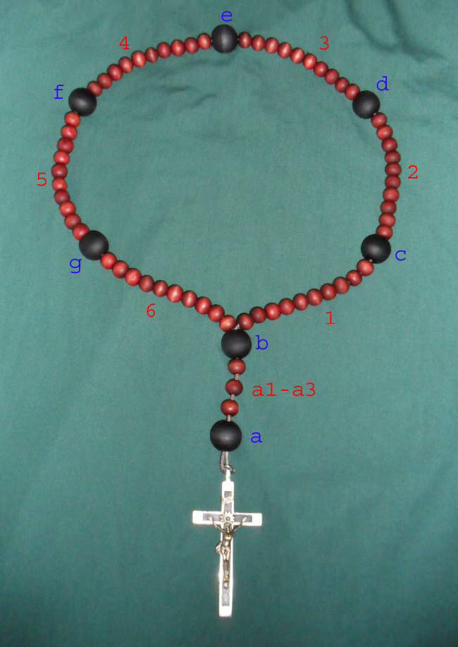 Bei den kleinen roten Perlen (a1-a3) je Perle 1x: Gegrüßet seist du, Maria, voll der Gnade, der Herr ist mit dir. Du bist gebenedeit unter den Frauen, und gebenedeit ist die Frucht deines Leibes, Jesus, Heilige Maria, Mutter Gottes, bitte für uns Sünder jetzt und in der Stunde unseres Todes. Amen