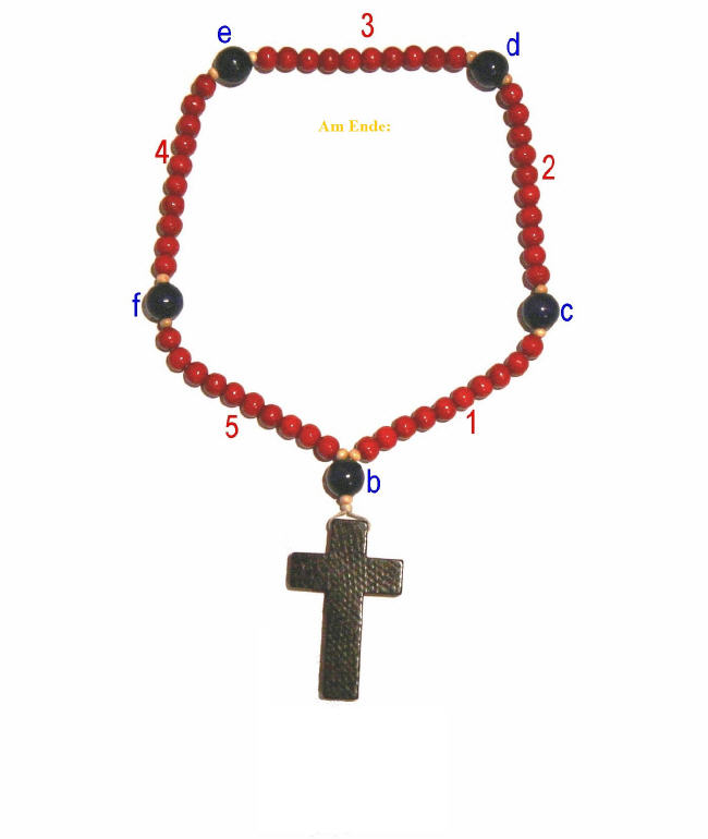 Bei der großen Perle (b) je 1x: Himmlischer Vater, wir opfern Dir die unendlichen Verdienste und Schmerzen des heiligen Antlitzes Jesu auf, Sein kostbares Blut, Seine Wunden und Tränen - zu Deiner größeren Ehre und für das Heil unserer Seelen.