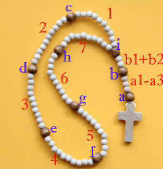 Ich glaube an Gott, / den Vater, den Allmächtigen, / den Schöpfer des Himmels und der Erde, / und an Jesus Christus, / seinen eingeborenen Sohn, unsern Herrn, / empfangen durch den Heiligen Geist, / geboren von der Jungfrau Maria, / gelitten unter Pontius Pilatus, / gekreuzigt, gestorben und begraben, / hinabgestiegen in das Reich des Todes, / am dritten Tage auferstanden von den Toten, / aufgefahren in den Himmel; / er sitzt zur Rechten Gottes, des allmächtigen Vaters; / von dort wird er kommen , zu richten die Lebenden und die Toten. Ich glaube an den Heiligen Geist, / die heilige katholische Kirche, / Gemeinschaft der Heiligen, / Vergebung der Sünden, / Auferstehung der Toten / und das ewige Leben. / Amen Bei der kleinen grauen Perle (b2) 1x: (für die "Gottheit" Christi) Gegrüßet seist du, Maria, voll der Gnade, der Herr ist mit dir. Du bist gebenedeit unter den Frauen, und gebenedeit ist die Frucht deines Leibes, Jesus. Heilige Maria, Mutter Gottes, bitte für uns Sünder jetzt und in der Stunde unseres Todes. Amen