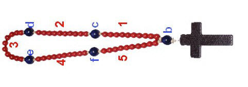Ich grüsse und lobpreis Dich Vom Schosse des ewigen Vaters aus, Ich vertraue Dir mit dem Herzen Und mit den Worten Jesu, Deines göttlichen Sohnes, Ich liebe Dich aus und in den Gluten seiner göttlichen Liebe, Ich bin ganz Dein und alles was ich habe, gehört Jesus, durch Dich, Heiland ich vertraue auf Dich." Bei den grossen Perlen (d): "O meine liebe himmlische Mutter,