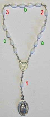 Gegrüßet seist du, Maria, voll der Gnade, der Herr ist mit dir. Du bist gebenedeit unter den Frauen, und gebenedeit ist die Frucht deines Leibes, Jesus. Heilige Maria, Mutter Gottes, bitte für uns Sünder jetzt und in der Stunde unseres Todes. Amen Bei den vier Perlen (c) je Perle 1x: Gepriesen sei die heilige und unbefleckte Empfängnis der seligen Jungfrau und Gottes Mutter Maria.